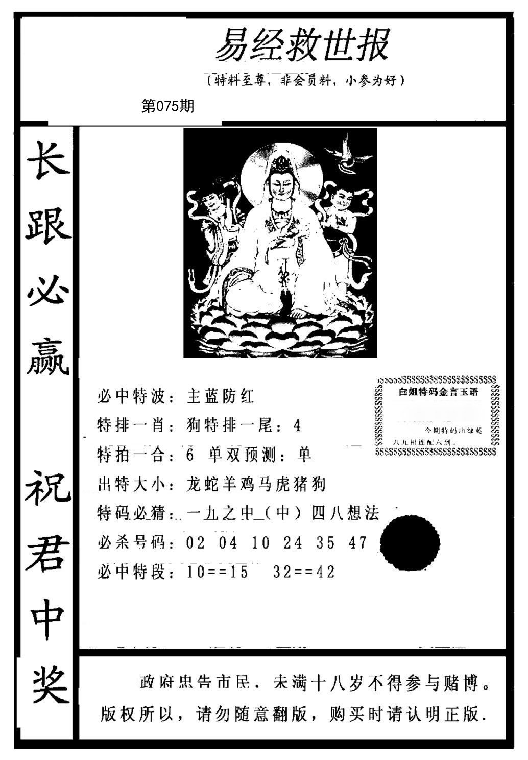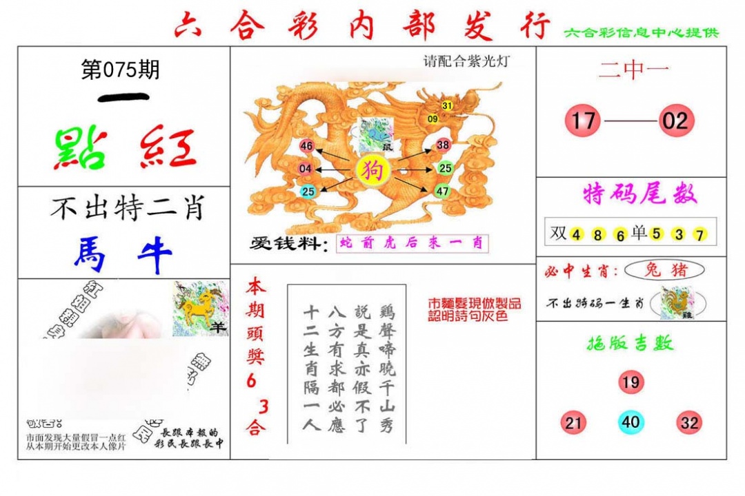 | 075期三肖:兔马狗 | 三码:40.25.45 |
